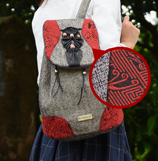 背包上的红黑相间图案是国家级非物质文化遗产壮锦,需由手工编织而成;“山寨”背包上的图案看似与之相同却是机器印刷而成。制图:李楠