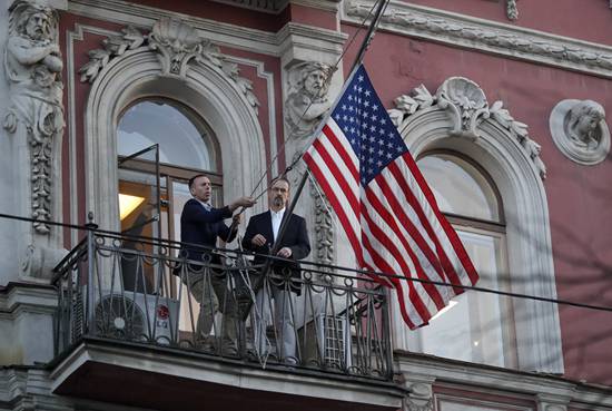 3月31日,在俄罗斯圣彼得堡,美国驻圣彼得堡总领馆的工作人员将美国国旗降下。俄罗斯外交部29日宣布关闭美国驻圣彼得堡总领馆,收回美国驻圣彼得堡总领馆的开馆和办公许可,要求其工作人员在3月31日前全部搬出俄方为其提供的办公场所。新华社/美联