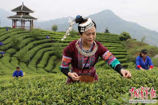 侗族妇女在布央村仙人山茶园采摘春茶。
