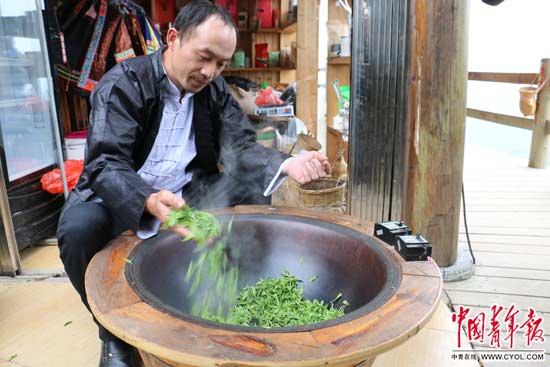 村民谢换军展示手工炒茶的技艺。