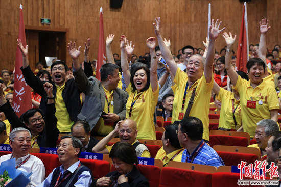 5月3日,北京大学百年讲堂,北京大学77级、78级经济系的同学在欢呼。当日,北京大学建校120周年暨77级、78级入学40周年纪念大会在这里举行,来自北京大学77级、78级23个院系的1000余名毕业生及家属参加了活动,他们来自全国各地,有的专程从国外赶来。