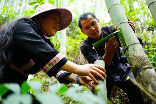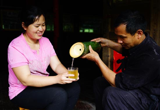 村民从竹子中取酒。