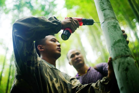 村民钻孔准备制作竹酒。