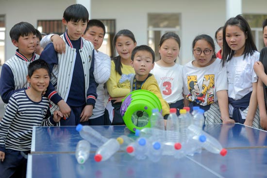 浙江省余姚市黄家埠镇横塘小学学生在学校里的“阳光少年成长乐园”体验空气炮趣味游戏。近日,浙江省余姚市以“村(社区)主办、学校支持”的模式创建“阳光少年成长乐园”,在每天下午放学后,由志愿者和教师对学生进行作业辅导,同时定期开展一些科技、非遗、趣味游戏等活动,丰富学生课余生活。张辉/摄(新华社发)