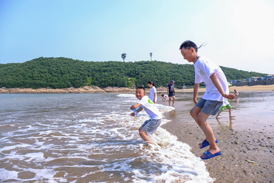 7月31日,来自西藏仁布县的小学生次旺土旦(左)和扎西旺杰在宁波象山的沙滩上第一次感受大海的魅力。