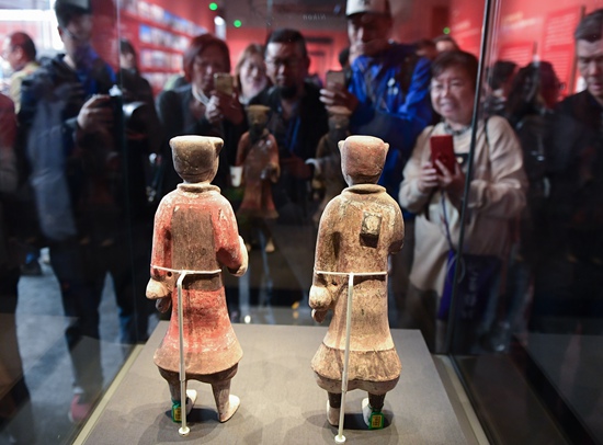 4月24日,观众在展柜前欣赏展出的文物。当日,“归来——意大利返还中国流失文物展”亮相中国国家博物馆。新华社记者 李贺/摄