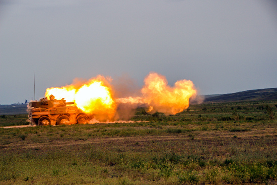 近日,新疆军区某炮兵团在天山脚下,组织轮式突击火炮实弹射击,锤炼部队在复杂条件下的精准打击能力。李仁锡/摄