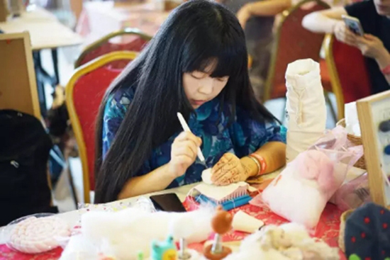 “沙沙沙……”指甲盖大小的一层羊毛,苏芳捏着戳针刺了百十下,终于让松散的羊毛变成紧致的“皮肤”,牢牢覆盖在内层骨架上。这样的工作,苏芳每天能在手工台上做近10个小时,“喜欢,所以一点儿不觉得枯燥”。