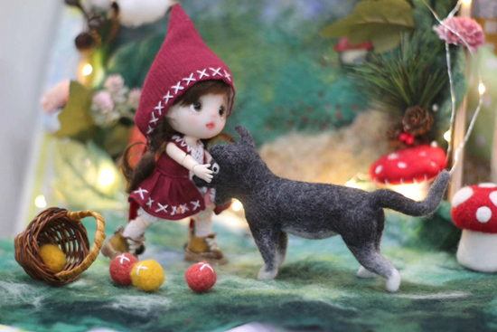 如今,苏芳与一名代理人合作销售现有作品。苏芳说:“羊毛毡不同于流水线产品,不是布娃娃,它不仅精细程度更高、仿真效果更好,还包含着手作人的心血。几百元几千元的定价也不是随随便便喊出来的,要根据工序和材料计算成本得出。”她拿出最近制作的一只憨态可掬的“大灰狼”向中国青年报·中国青年网记者举例,为了追求仿真度,狼的牙齿是软陶烧制的;骨架也选用进口的可塑性材料,因此四肢和尾巴都可以活动。这只“狼”是她与朋友合作的“小红帽”系列作品中的一个,作品工序复杂,制作精细,加上材料优质,定价在600元左右。