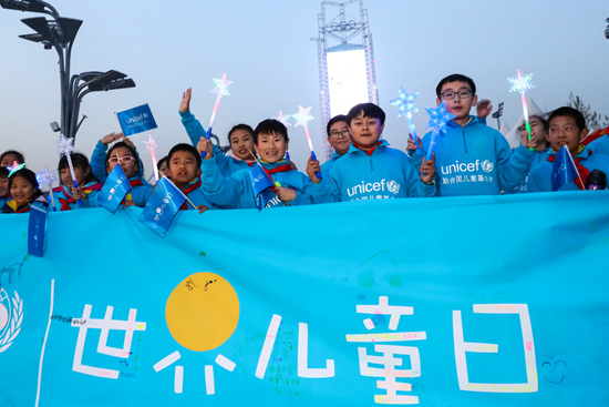 11月20日,北京冬奥组委与联合国儿童基金会共同在北京奥林匹克公园中心区举办“点亮儿童未来”主题活动,来自北京市的学生们展示主题长卷。当日是世界儿童日,多地举办“点亮儿童未来”主题活动,不少标志性建筑点亮蓝色灯光。新华社记者 张玉薇/摄