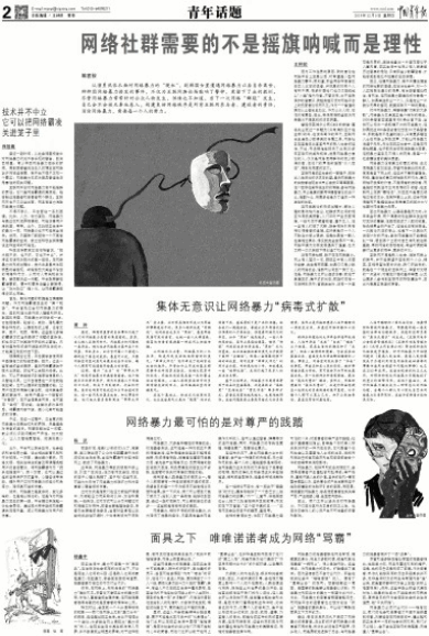 人性中晦暗的一面无法消除,但要预防和禁绝网络暴力,需要建构起一套完整的法律与伦理秩序,来遏制这种负面的“集体无意识”的生成。《互联网电子公告服务管理规定》《互联网信息管理办法》《文明上网自律公约》等法规和准则已经被逐步落实,针对网络暴力中诽谤问题的《最高人民法院、最高人民检察院关于办理利用信息网络实施诽谤等刑事案件适用法律若干问题的解释》也已在2013年发布。这些法规编织的正义之网,对预防和惩处网络暴力问题起到了制度上的保障作用。在这个基础上,反对网络暴力理应成为一种常态化的网络伦理,当每个人都从内心深处自觉与网络暴力划清界限时,这些污言秽语才能彻底消除。