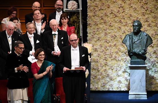 12月10日,在瑞典首都斯德哥尔摩,今年诺贝尔经济学奖获奖者之一、经济学家迈克尔·克雷默(前)登台领奖。2019年诺贝尔物理学奖、化学奖、生理学或医学奖以及经济学奖颁奖仪式10日在瑞典首都斯德哥尔摩举行。新华社/法新