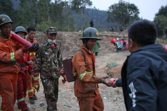 4月2日傍晚,四川西昌,在扑灭现场所有明火和烟点后,多支参与扑火的消防队伍从位于泸山南麓的正大酒庄后山下撤。当地居民们搬来了一箱箱饮料、水果,在山下等候消防指战员,为他们送上诚挚的谢意。汪龙华/摄