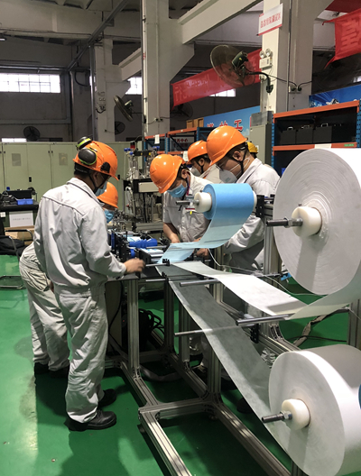 “跟我们平时经常打交道的发动机不同,生产口罩用的是很柔软的材料,所以在焊接鼻梁条、折边和耳带时,更难控制口罩的位置。一旦跑偏就会导致口罩压得不好、鼻梁条穿得不对之类的工艺问题。”他总结说,纸上得来终觉浅,要生产出符合要求的一次性医用口罩,就要一次又一次地调试设备。