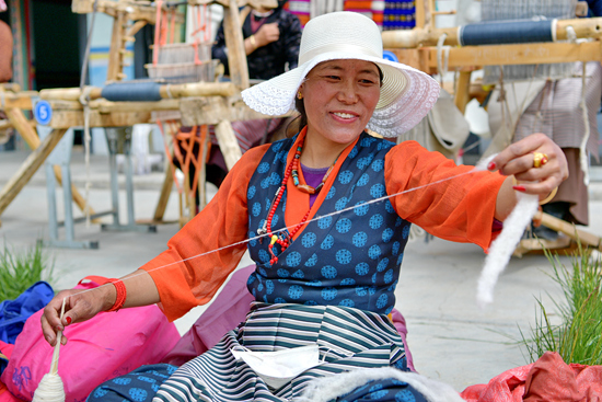 4月28日,选手曲宗在贡嘎县劳动技能大赛上参加捻毛线比赛。日前,西藏山南市贡嘎县开展劳动技能大赛,21名农牧民选手进行卷毛线、捻毛线和织“邦典”技能比赛。“邦典”意为毛织围裙,是藏族妇女服装上的一种彩色围腰。编织“邦典”是列入国家非物质文化遗产名录中的传统技艺。新华社记者 张汝锋/摄