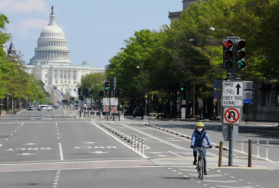 “保经济”与“稳疫情”在美国形成拉锯局面。当地时间4月16日,白宫公布了分阶段重启经济的指导方针,并把决定权交给了各州州长。图为当日拍摄的华盛顿宾夕法尼亚大道。陈孟统(美国分社)/中新社/人民视觉