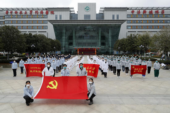 在华中科技大学同济医院中法新城院区,北京大学第一医院、北京大学人民医院、北京大学第三医院医疗队的党员和入党积极分子代表重温入党誓词。新华社供图