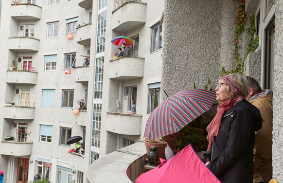 4月28日,在瑞士日内瓦,住在圣-让公寓中的居民在阳台上参加合唱活动。当日,瑞士日内瓦圣-让公寓的居民们组织了一场合唱活动,为管控措施下的居家生活增添乐趣。新华社/路透