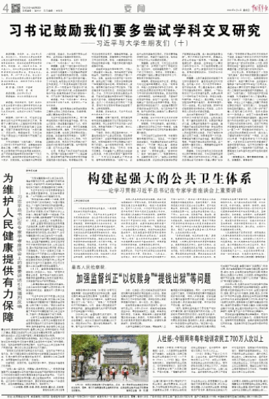 习书记在浙江主政的时候,对教育改革非常重视和关心。他说过,“不仅要开发学生智力,而且要培养学生的创新和实践能力”;“不仅要‘授之以鱼’,教授学生‘学会’,而且要‘授之以渔’,教授学生‘会学’”;青年学生要从“会读书的人”变成“会创造的人”;“既要读有字之书,也要读无字之书”。“坚持以创新带动教育教学改革,切实把创新实践活动贯穿于教育教学全过程,走一条创新型教育之路”。我们开展交叉学科研究,聚集这么多专业的学生一起思考、一起碰撞,就是要创新、要实践,这样学生们从事交叉学科研究工作,不仅能获得有意义的研究成果,还可以掌握研究的方法与技能、思考的逻辑与辨伪,加快成长为创新型人才。