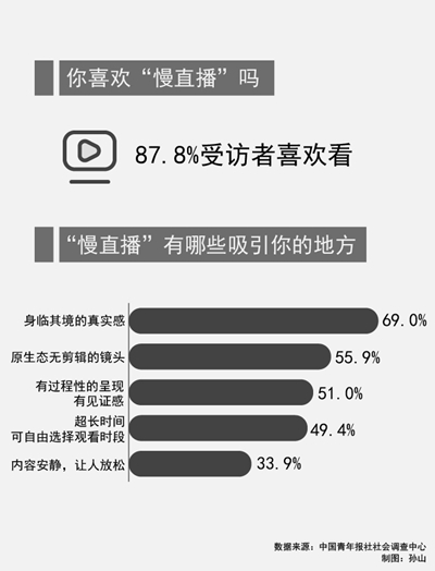 调查显示,90.2%的受访者看过慢直播,87.8%的受访者喜欢看慢直播。