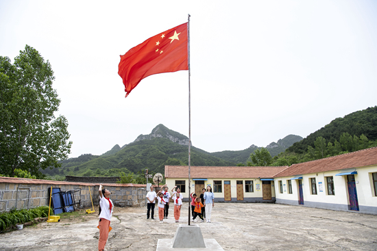 6月2日,开学第一天,马武寨寄宿制小学举行了升旗仪式。马武寨寄宿制小学位于山西省陵川县古郊乡马武寨村,也是方圆几十公里内唯一的学校,全校共有7名学生。新华社记者 杨晨光/摄