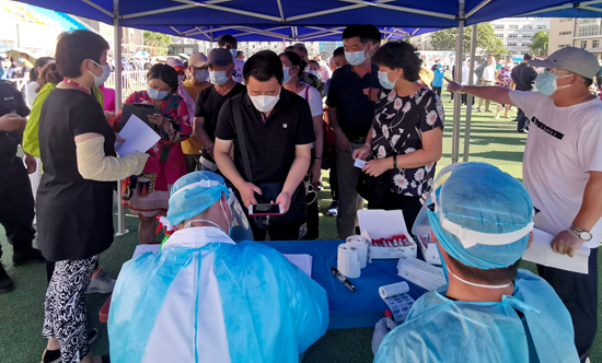 6月14日,北京市民在宣武体育场进行核酸采样。15日下午,北京市疾控中心副主任庞星火介绍,6月14日0时至24时,北京市新增新冠肺炎确诊病例36例,已完成流调34例,均与新发地市场有关,还有2例正在流调中。杜洋/摄(中新社)