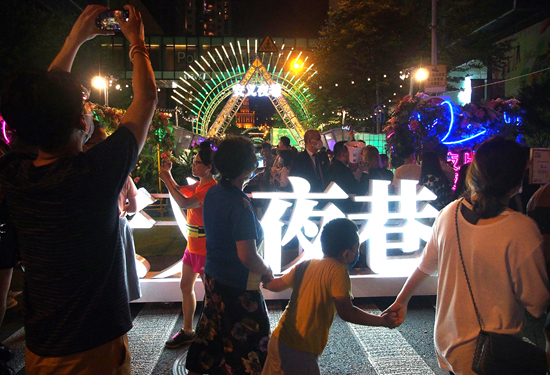 游客在上海市静安寺附近的安义夜巷享受夜晚休闲时光。从6月初开始,随着上海首届夜生活节启动,上海市的多处地标性夜生活集聚区从主题、氛围、业态、艺术文化、社群活动和社交互动等层面进行了升级,助推上海“夜经济”绽放新活力。新华社记者 陈飞/摄