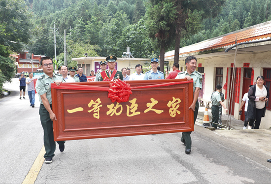 8月7日,贵州省盘州市乌蒙镇八担山村里像过年一样,乡亲们燃放起鞭炮,敲锣打鼓欢迎抬着“一等功臣之家”牌匾的送喜报队伍。戴着大红花的武警河北省总队唐山支队特战排排长何格走在队伍中间,胸前一排排奖章特别耀眼。