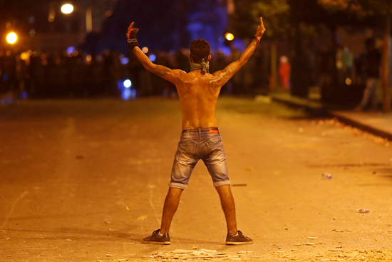 当地时间8月11日,黎巴嫩贝鲁特,民众持续在议会大楼附近示威,投掷石块、破坏路障、纵火,并与防暴警察发生冲突。尽管黎政府已宣布辞职,仍未能平息民众因贝鲁特爆炸事件引发的不满情绪。人民视觉供图