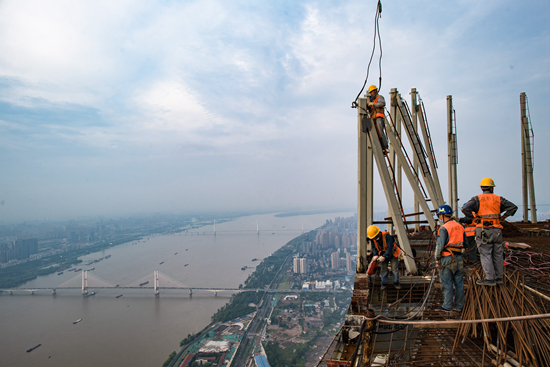 8月11日,工人在武汉绿地中心项目建设现场近500米的高空施工。正值高温天气,在武汉绿地中心项目建设现场近500米高的“云端”,300多名中建三局二公司的工人挥汗如雨,伴着脚下的长江波涛,稳步推进工程建设。新华社记者 肖艺九/摄