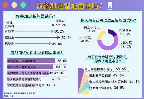 近日,中国青年报社社会调查中心联合问卷网(wenjuan.com),对1521名受访者进行的一项调查显示,75.3%的受访者认为自己可以适应智能面试,50.3%的受访者觉得自己在智能面试中表现好。面试流程比较机械生硬(55.0%)和缺少人与人的交流互动(53.1%)是智能面试的主要难点。为了更好地准备智能面试,68.6%的受访者会自己对着摄像头练习。