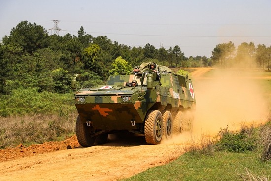 炎炎烈日下,树木葱郁的山林间,该旅合成一营卫生员周志鹏乘坐一辆喷涂红十字标志的轮式装甲救护车,高速机动于卫勤救护途中,执行转运“伤员”任务。
