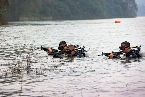 武装泅渡是特战力量遂行全域作战的基本能力。在学习训练时,开始猎14以为只是普通的游泳,“能够游动3公里以及负重游泳就行”。但一切与他想的大不一样,在水中,队员们需要完成踩水、潜水、水中侦察、水下定向等课目。尤其是在踩水过程中,队员们必须将手上的枪械举过头顶,用双脚不停踩水产生浮力,推动自身前进。