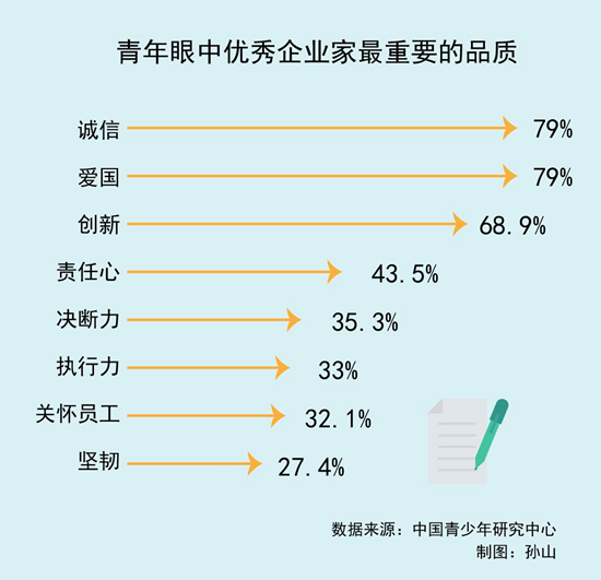 受访青年认为优秀企业家最重要的品质是爱国和诚信