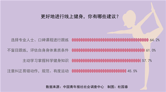 线上健身已成为人们日常运动锻炼的重要方式。如何更加科学有效地线上健身?日前,中国青年报社社会调查中心联合问卷网(wenjuan.com),对2008名受访者进行的一项调查显示,进行线上健身,64.2%的受访者建议选择专业人士、口碑课程跟练,61.0%的受访者指出不盲目跟练,要评估自身身体素质条件。