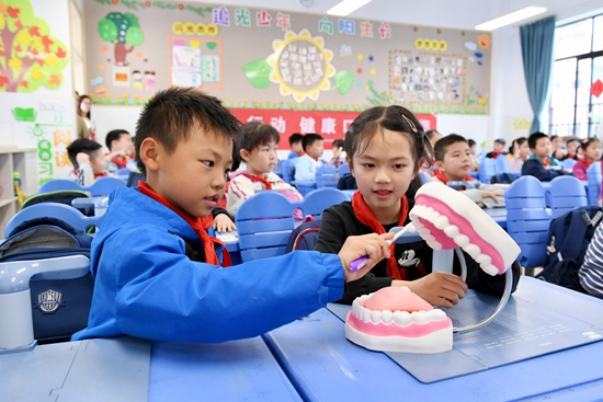近日,合肥市包河区常青街道薛河湾社区团总支联合新时代文明实践站来到合肥市西递小学,开展生动有趣的“暖民心”口腔健康科普活动。李予/摄
