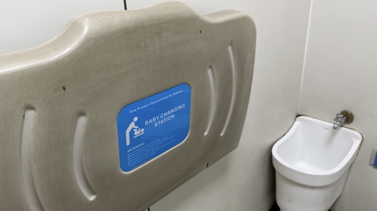 而这个母婴室实际上只是在女厕所的一面墙上安装了一个折叠尿布台,将尿布台展开后,厕所过道只能勉强通过一人。