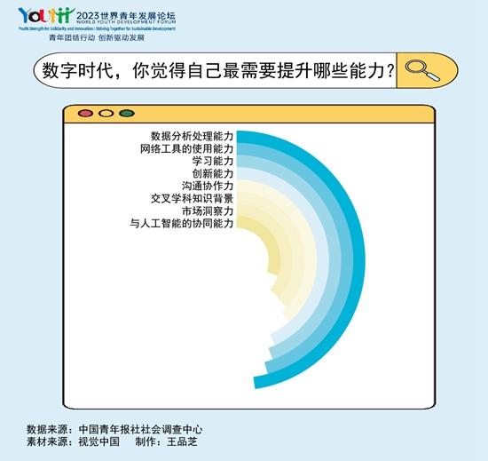 调查显示,受访青年觉得在数字时代,自己最需要提升数据分析处理能力(47.7%)、网络工具的使用能力(45.7%)、学习能力(44.4%)和创新能力(43.2%)。