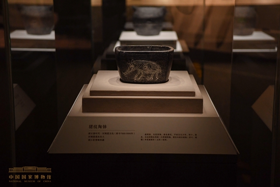 一件来自浙江省博物馆的馆藏精品——猪纹陶钵,是首次在北京展出。陶钵方形平底,四角弧圆,陶瓷界有句话“十圆不如一方”,这证明河姆渡人的制陶水平已经相当不错。陶钵外壁上,流畅的线条刻画了一只介于野猪和家猪之间的猪的模样。尽管小猪养大了大概率还是会被吃掉,但不妨碍人们在生活中对它持有的朴素审美和浪漫情趣。
