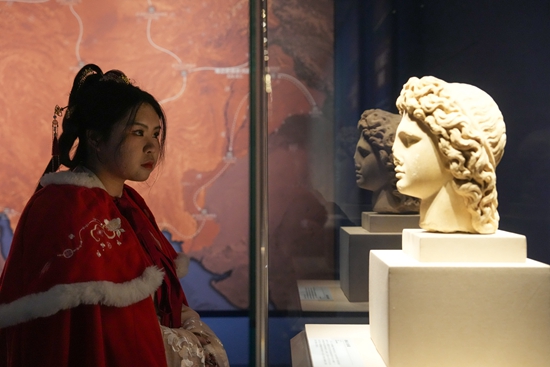 1月3日,一名观众在湖南博物院参观“神话国度 璀璨爱琴海——古希腊文明史诗”展。