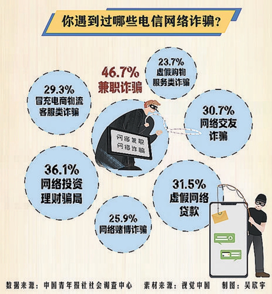 刷单兼职、网络虚假投资、网络交友骗局……如今,电信网络诈骗的手法变得愈发复杂、隐蔽,公安部门也连续对此开展了多轮打击行动。近日,中国青年报社社会调查中心联合问卷网(wenjuan.com),对1500名受访者进行的一项调查显示,在各种电信网络诈骗手法中,刷单返利等兼职诈骗是受访者遇到最多的网络诈骗类型,70.7%的受访者期待严惩非法买卖、出租、出借电话卡、银行账户等帮助信息网络犯罪行为。