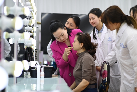 4月7日,重庆市沙坪坝区小龙坎街道重庆泽宇乐尚职业培训学校,学员正在上美容师(中级)实训课。视觉中国供图