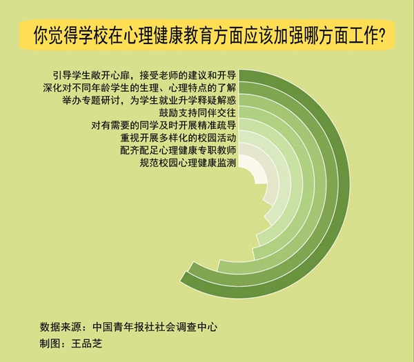 学校在心理健康教育方面还应该加强哪方面工作?对此,58.9%的受访家长期待学校引导学生敞开心扉,接受老师的建议和开导,58.6%的受访家长期待学校深化对不同年龄学生的生理、心理特点的了解,54.0%的受访家长希望举办专题研讨会,为学生就业升学释疑解惑。