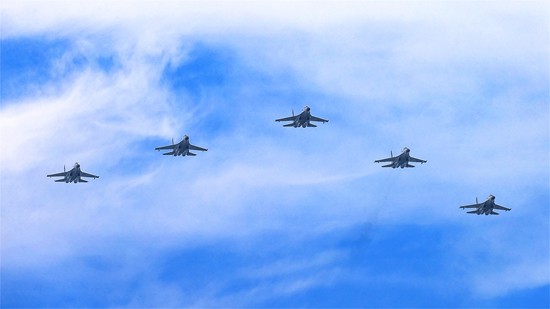 近日,空军西安飞行学院某旅战高温、迎“烤”验,严密组织空战机动、空战战术、对地攻击战术等多个课目飞行训练,在实战环境下不断锤炼飞行员过硬战斗技能。图为五机编队通场。崔保亮/摄