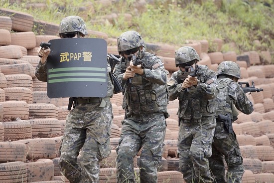 10月18日,武警广西总队玉林支队组织官兵在陌生环境围绕山地捕歼、渗透侦察、小组战术等多个训练课目开展实战化综合演练,进一步提升部队的综合作战能力,为今后遂行多样化任务奠定坚实基础。图为武警官兵交替掩护搜索目标。余海洋/摄