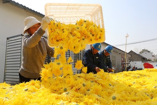 11月6日,河南省许昌市鄢陵县张桥镇裴庄村村民在采收金丝皇菊。立冬节气将至,各地农民抢抓农时,开展采收、播种、农作物管护等农事,田间地头一派繁忙景象。牛书培/摄(新华社发)