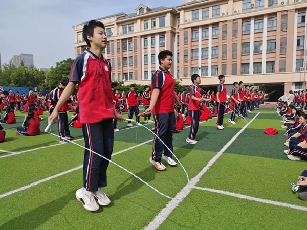 在二桥中学的40分钟“阳光大课间”,武术操、街舞啦啦操、跑操、体能操、有氧跳绳等项目轮番上阵。学校每月更新锻炼内容和背景音乐,以激发学生的运动热情。