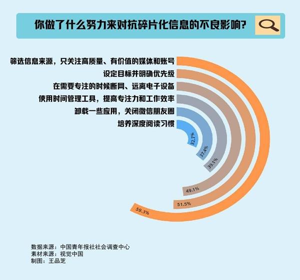 近日,中国青年报社社会调查中心联合问卷网(wenjuan.com),对1341名受访者进行的一项调查显示,63.3%的受访者会随时随地刷短视频,61.7%的受访者经常查看社交媒体。长时间接收碎片化信息,50.3%的受访者感觉自己思考能力下降,逻辑不清晰。59.3%的受访者建议筛选信息来源,关注高质量、有价值的媒体和账号。