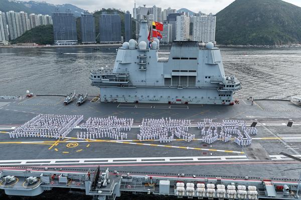 山东舰飞行甲板上,14架舰载战斗机、直升机整齐列阵,700余名海军官兵身着白色军装排出“国安家好”4个大字,表达着爱国爱港的深情厚谊和美好祝福。海上,消防船喷射出巨大的水柱,以高规格的“水门礼”欢迎编队的到来;空中,香港特区伴飞直升机实时直播编队进港实况;岸边,大批热情民众挥舞着国旗和香港特别行政区区旗,兴奋地向来访官兵欢呼致意。