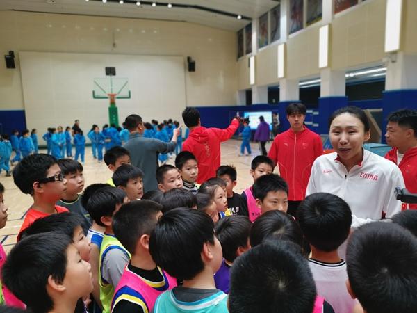 12月19日,北京,史家胡同小学,全国政协委员、著名女子篮球运动员苗立杰在指导学生们打篮球。当日,全国政协委员履职“服务为民”冠军思政课活动在这里举行。视觉中国供图